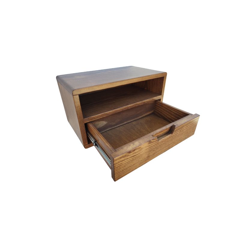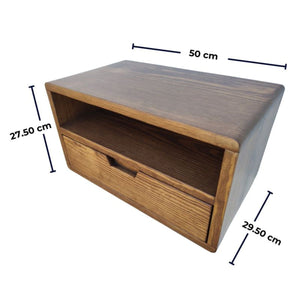 Estos muebles cuentan con un cajón de madera cada uno y con correderas de extensión que le dan una apertura suave y fácil, aporta un toque elegante y moderno. Su construcción en madera de pino solida de 20 mm de espesor barnizados en nitro laca semi mate asegura durabilidad y resistencia.