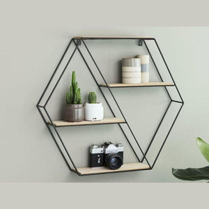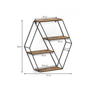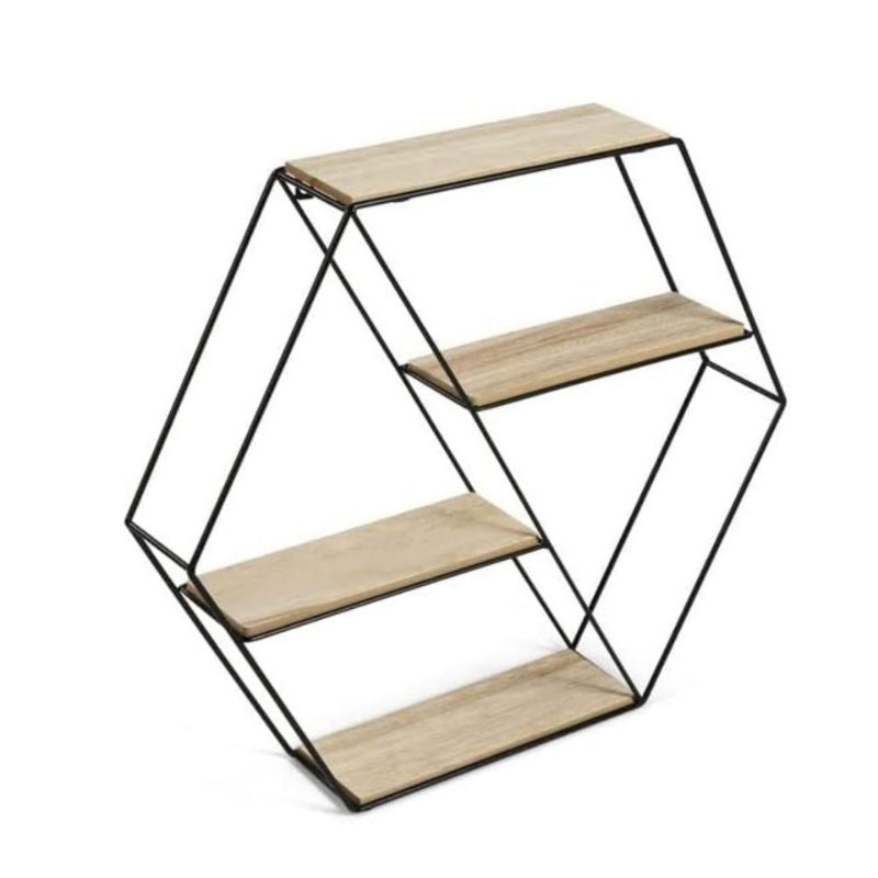 Dale un toque moderno y elegante a tus espacios con este estante flotante hexagonal de diseño contemporáneo. Su combinación de estructura metálica en color negro y repisas de madera crea un equilibrio perfecto entre estilo industrial y minimalismo moderno.