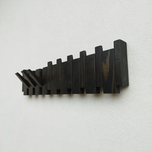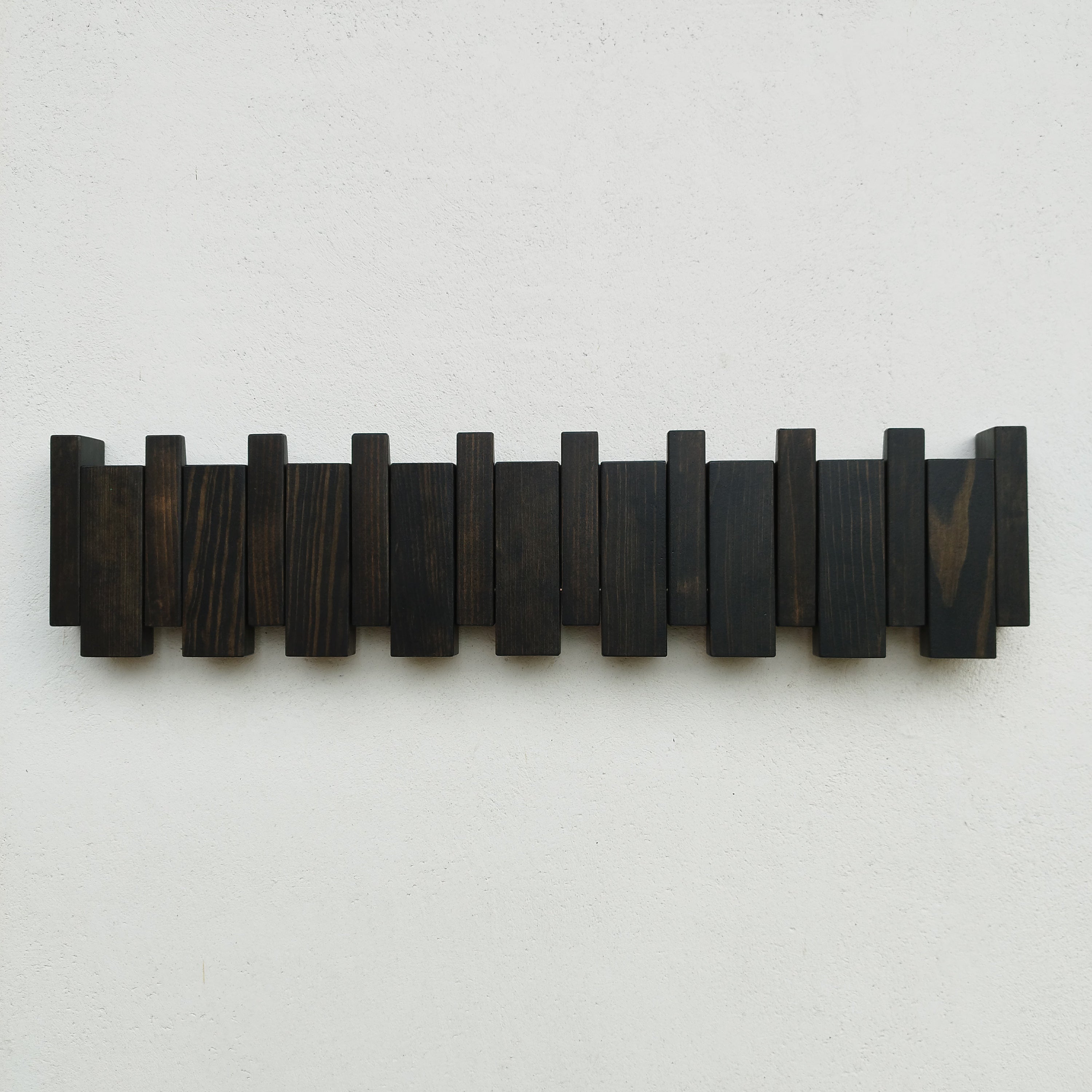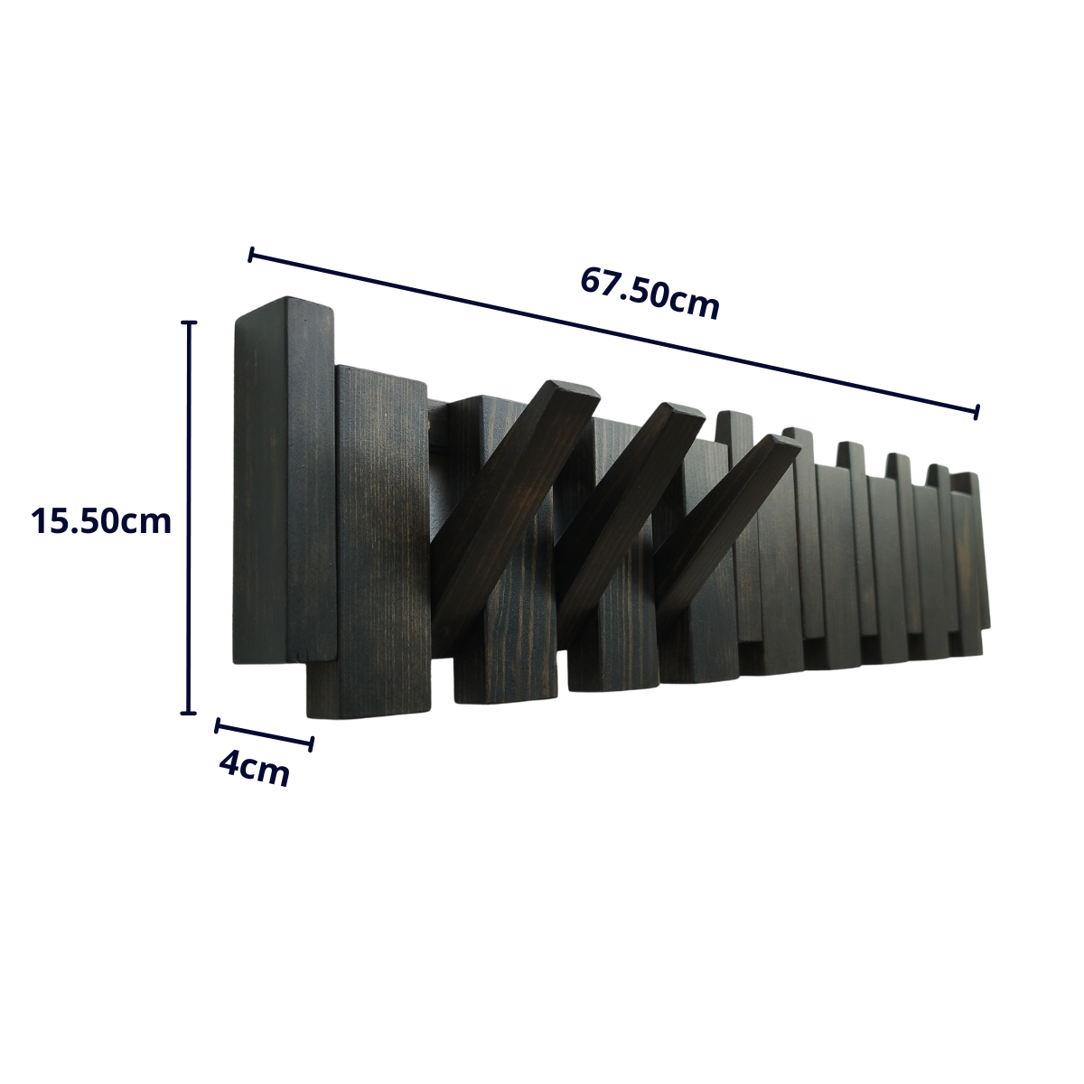 Este perchero de pared combina funcionalidad y diseño moderno en una sola pieza. Fabricado en madera natural y terminado en un elegante color negro grafito, cuenta con 8 ganchos abatibles que se integran perfectamente al diseño cuando no están en uso. Su acabado en laca mate resalta la textura de la madera y le da un toque sofisticado, ideal para entradas, habitaciones u oficinas. Perfecto para quienes buscan ordenar con estilo sin ocupar espacio.